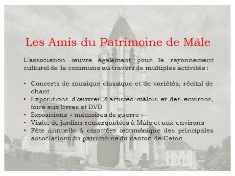 Les Amis du Patrimoine de Mâle sont une association dédiée à la préservation et la valorisation du patrimoine culturel et historique de notre village. Depuis plusieurs années, nous organisons des activités variées pour sensibiliser et impliquer la communauté dans cette mission essentielle.